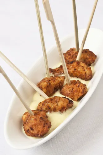 Elegant canapés featuring tender chicken pieces, artfully arranged for a gourmet start.