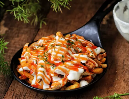 Creamy fries mixed with chicken, a rich, satisfying dish.